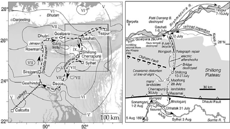 ১৮৯৭ সালের ভয়াবহ ভূমিকম্পে প্রায় ধ্বংসস্তূপে পরিণত হয়েছিল সিলেট–আসাম অঞ্চল। শিলং প্ল্যাটোর নিচে থাকা বিশাল ওল্ডহ্যাম ফল্ট এক লাফে ১১–১৬ মিটার সরে যাওয়ায় সৃষ্টি হয়েছিল ভারতীয় উপমহাদেশের ইতিহাসে অন্যতম শক্তিশালী ভূমিকম্প, যার মাত্রা ছিল ৮.২–৮.৩।