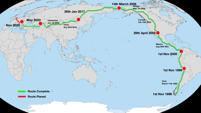 ১৯৯৮ সালে চিলির পুন্তা আরেনাস থেকে যাত্রা শুরু। হিসাব ছিল- ৩১ হাজার মাইল পথ পাড়ি দিতে সময় লাগবে ১২ বছর। কিন্তু বাস্তবটা হলো আজ ২৭ বছর পরও তিনি হাঁটছেন। বয়স এখন ৫৬।