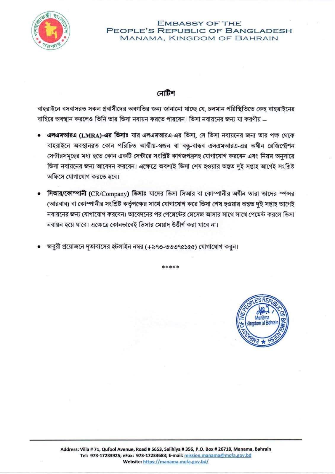 জরুরি প্রয়োজনে প্রবাসীদের মানামায় অবস্থিত বাংলাদেশ দূতাবাসের হটলাইন নম্বর (+৯৭৩-৩৩৩৭৫১৫৫)-এ যোগাযোগ করার জন্য অনুরোধ জানানো হয়েছে।