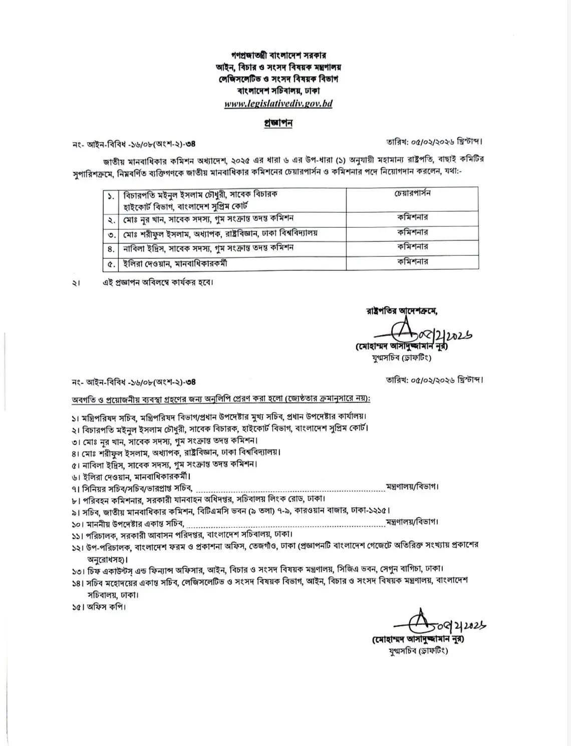 যুগ্মসচিব মোহাম্মদ আসাদুজ্জামান নূরের সই করা প্রজ্ঞাপনে বলা হয়, জাতীয় মানবাধিকার কমিশন অধ্যাদেশ, ২০২৫-এর ধারা ৬-এর উপধারা (১) অনুযায়ী রাষ্ট্রপতি বাছাই কমিটির সুপারিশক্রমে তাদের এ নিয়োগ প্রদান করেছেন।