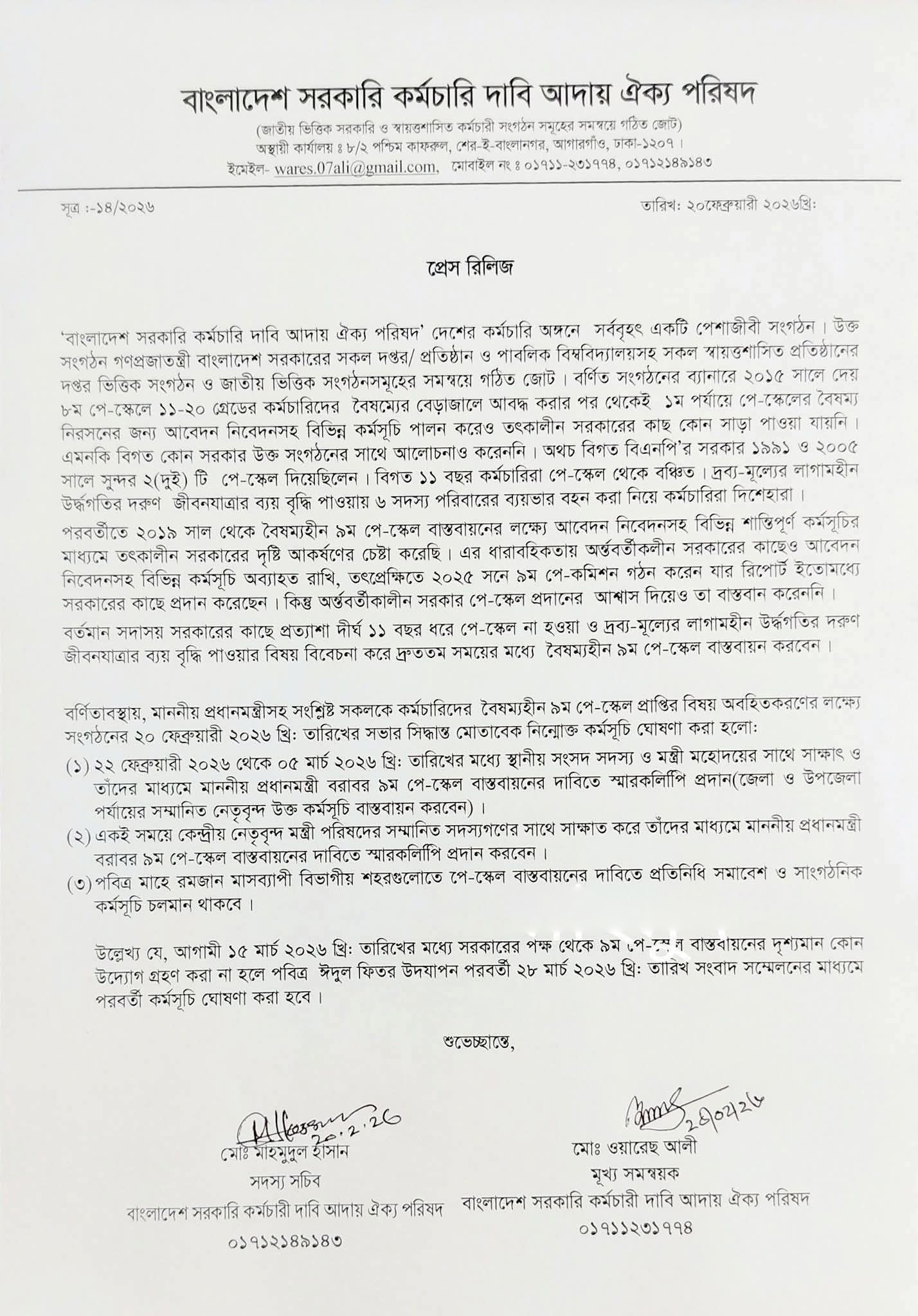 সংগঠনটির দাবি, গত ১১ বছর ধরে নতুন পে-স্কেল না হওয়ায় সরকারি কর্মচারীরা বঞ্চিত রয়েছেন। পাশাপাশি দ্রব্যমূল্যের ঊর্ধ্বগতির কারণে জীবনযাত্রার ব্যয় উল্লেখযোগ্যভাবে বেড়েছে, ফলে ছয় সদস্যের পরিবারের ব্যয়ভার বহন করা ক্রমেই কঠিন হয়ে পড়ছে।
